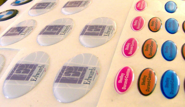 The stickers are ideal for machinery, computer cases, motor vehicles, advertising and promotional items. We also make DOMED NAME BADGES with a magnetic backing instead of your normal pin backing which marks your clothes and cannot be threaded though some material. The magnets we use are VERY strong and the name badge can even be worn on a leather jacket. We also make clear domed shapes that can be stuck over logo's or names on business cards or other printed matter, leaving your product with a "touch of class". The list is becomming endless with new ideas from ourselves and our customers alike. "Most people judge a product by its label. Domed labels add a glossy 3D look - raising your labels above the competition."